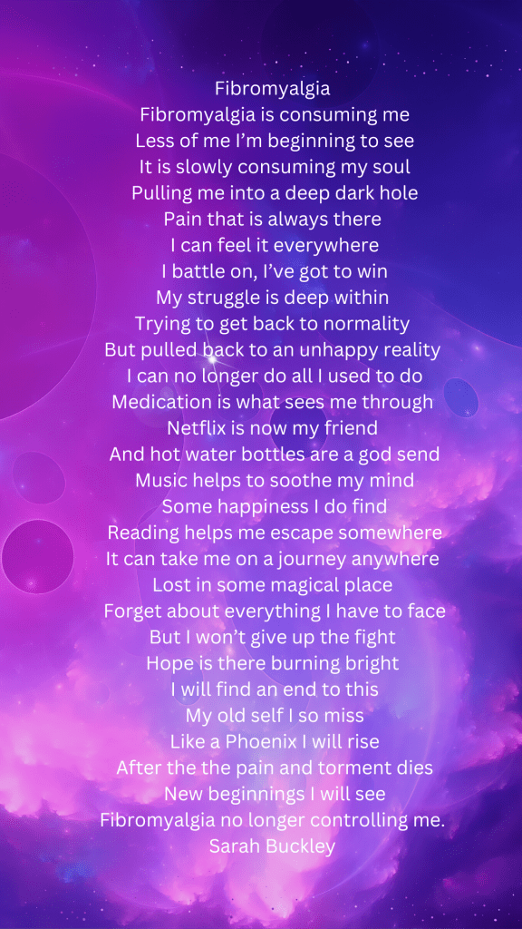 Writing poems about Fibromyalgia helps me to explain what it feels like to suffer with this invisible illness.