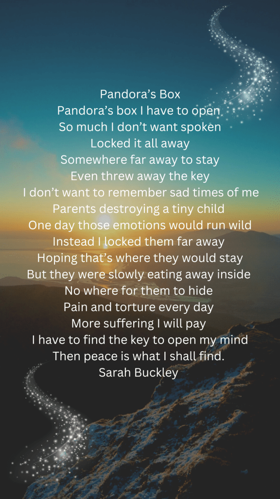 I’ve now been told that I need to maybe have some counselling to deal with my delightful childhood memories. Well I popped them all into Pandora’s Box and threw away the key and the spare one too. Apparently if you don’t deal with these things they force themselves out in other ways. For example, fibromyalgia. We shall see. I have a nice life apart from the fibromyalgia, but well parents were not the best. I think my mother is probably ruling hell and my dad, don’t know. Please don’t judge. They shouldn’t have been parents but luckily in a way they were because then I wouldn’t be here.