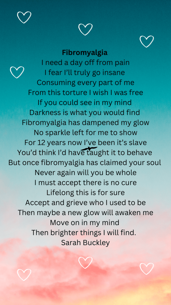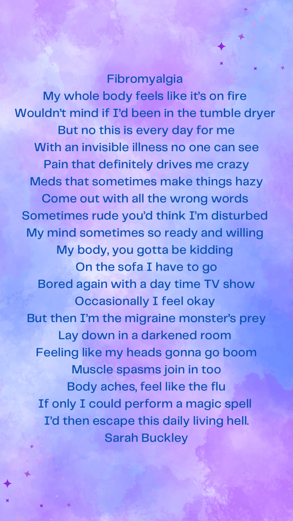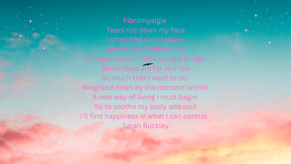I’ve been really struggling with pain lately and often feel like a prisoner in my own home and still upset that I had to give up my job. Fibromyalgia robs you of so many things. I write poems as it’s a way of expressing how I’m feeling.